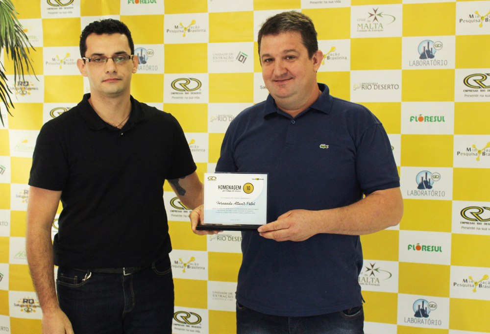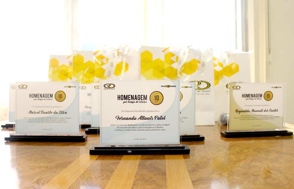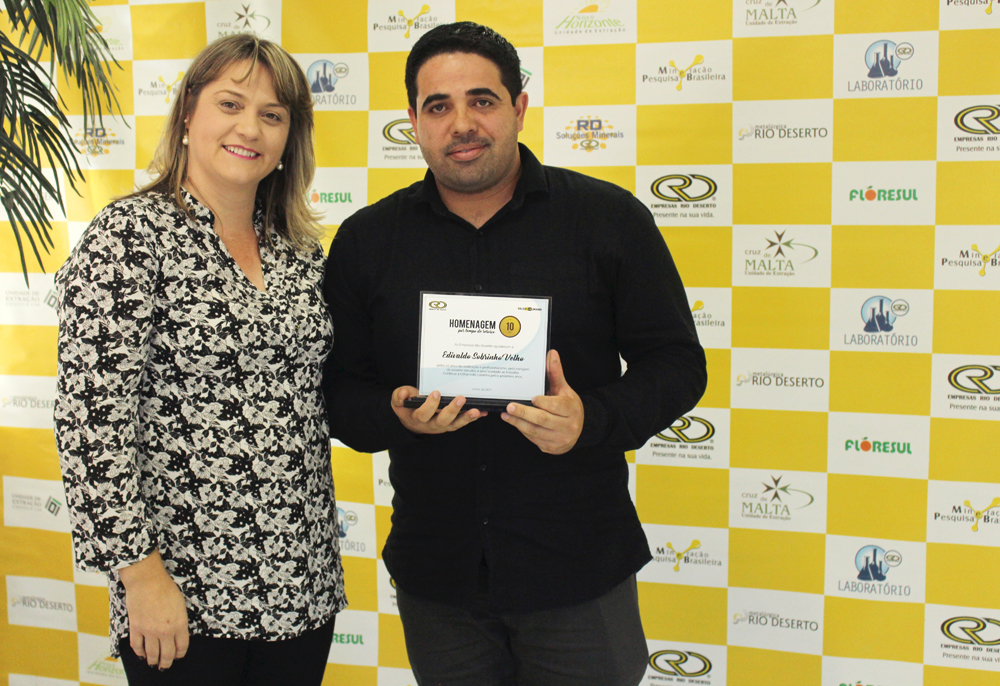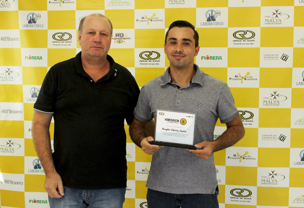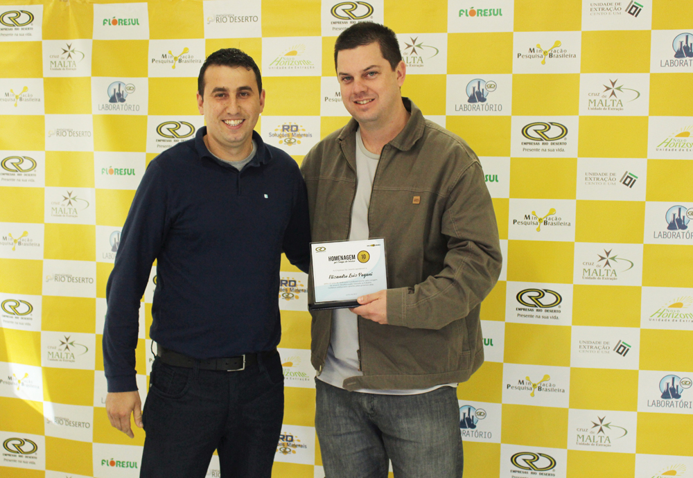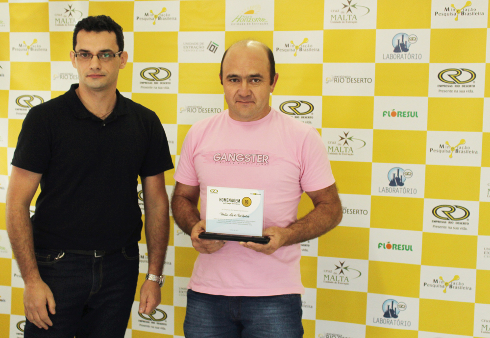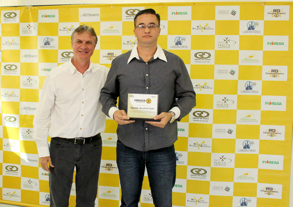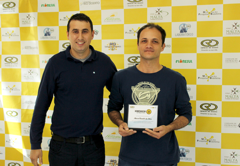 Receberam a homenagem pelos 10 anos de trabalho nas Empresas Rio Deserto, os colaboradores: Elizandro Luiz Pagani, Fernando Altanir Patel, Helio Alves Barbosa, Jonas Alberto Beltrame e Nelson Leandro (da Unidade Mina Cruz de Malta); Douglas Zeferino Soares e Edivaldo Sobrinho Velho (da Unidade Mina 101); e Marcel Duarte da Silva (da Unidade Metalúrgica). A homenagem pelos 15 anos de serviços prestados, por sua vez, foi entregue ao colaborador Reginaldo Manenti dos Santos (da Unidade Mina Novo Horizonte).