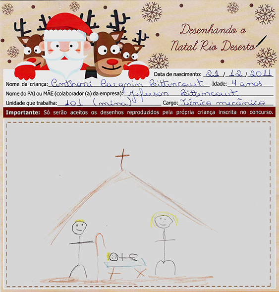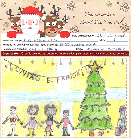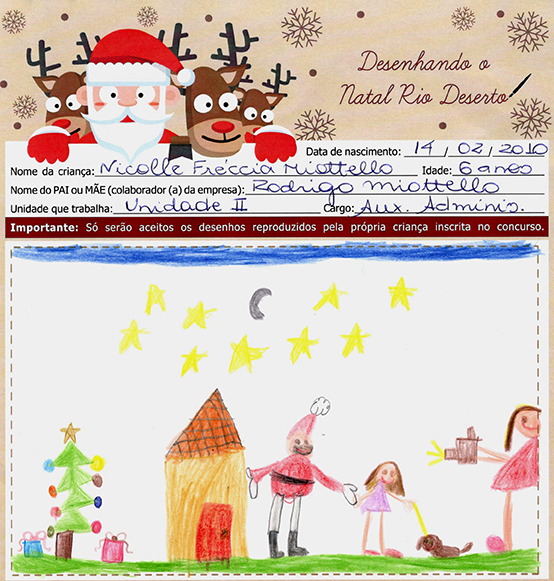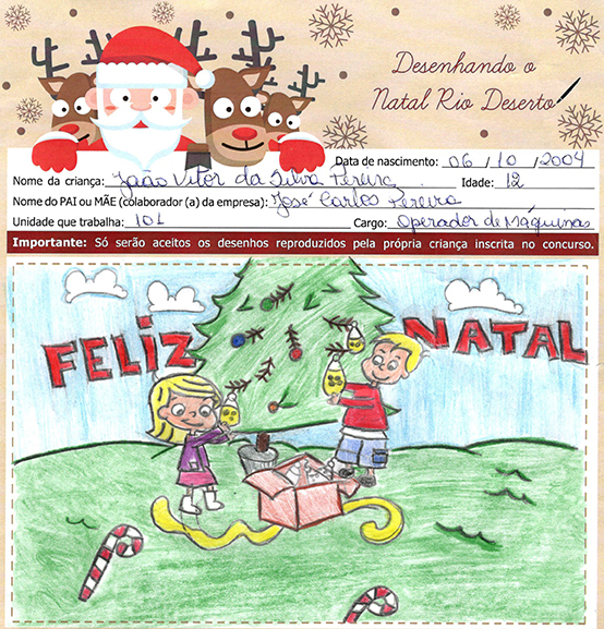 Esta terceira edição do projeto “Desenhando o Natal Rio Deserto” teve o tema “Natal é tempo de união!” e recebeu a inscrição de mais de 60 trabalhos. Os desenhos foram analisados por uma comissão julgadora, que escolheu dois desenhos de cada categoria. O concurso foi dividido em três categorias: uma para os pequenos com idade entre 4 e 6 anos, outra para os baixinhos de 7 a 9 anos, e mais uma categoria para as crianças com idade entre 10 e 12 anos.