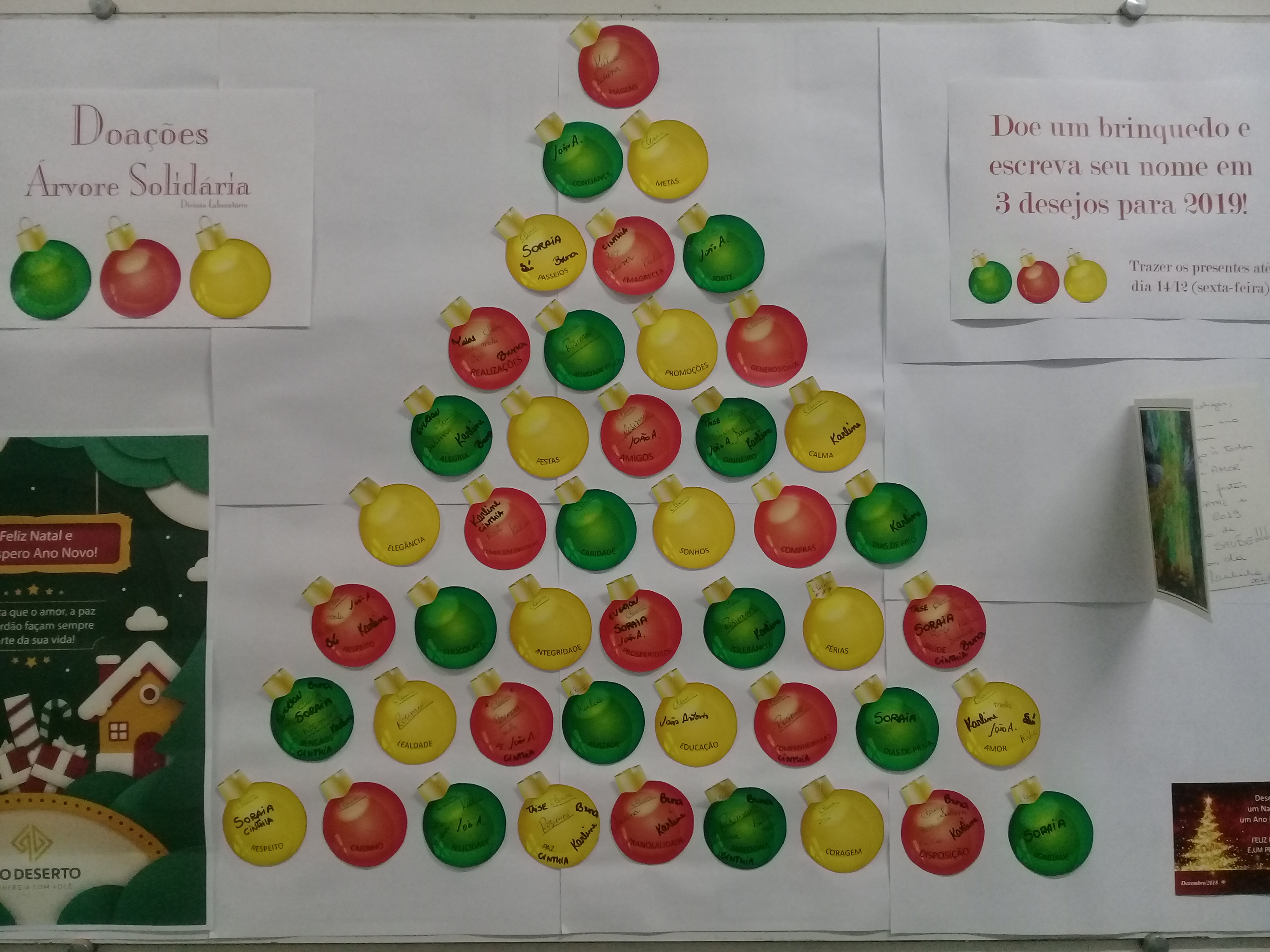 Colaboradores do Sistema Integrado de Gestão (SIG) e da Divisão Laboratório (com sede em Urussanga/SC), da Rio Deserto, se engajaram, neste fim de ano, na arrecadação de brinquedos para doação a crianças carentes. Para atingir o propósito, foi montada a Árvore Solidária de Natal, em que cada bolinha decorativa representava um desejo para 2019. A cada brinquedo doado, os colaboradores podiam escrever o nome em três bolinhas, representando desejos para o ano que vai iniciar.