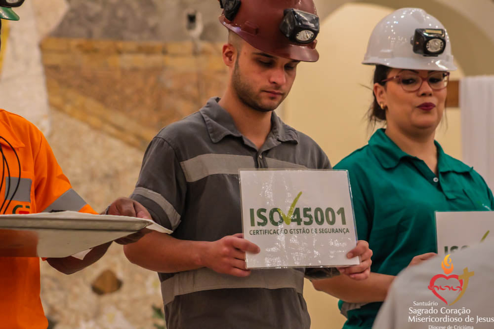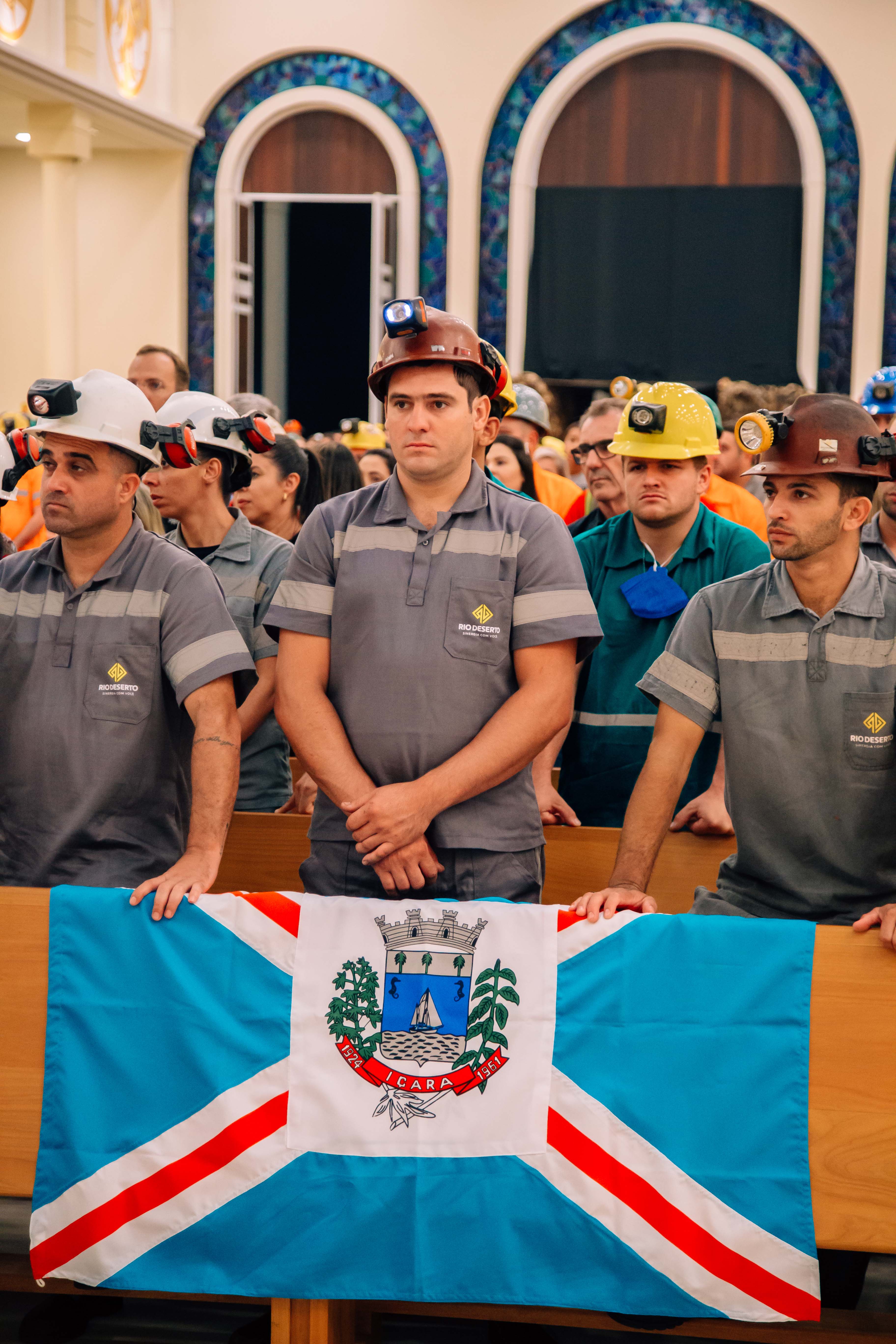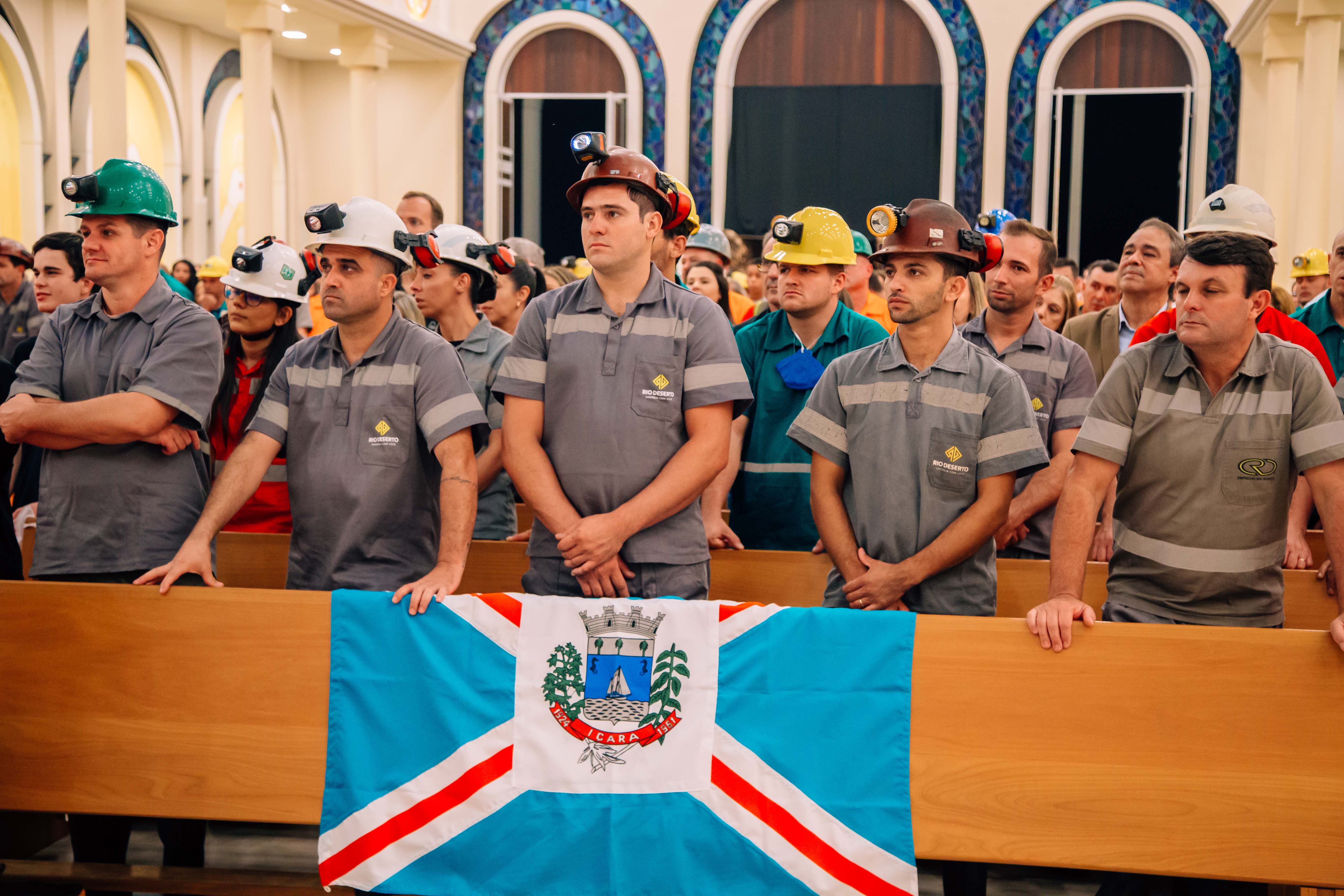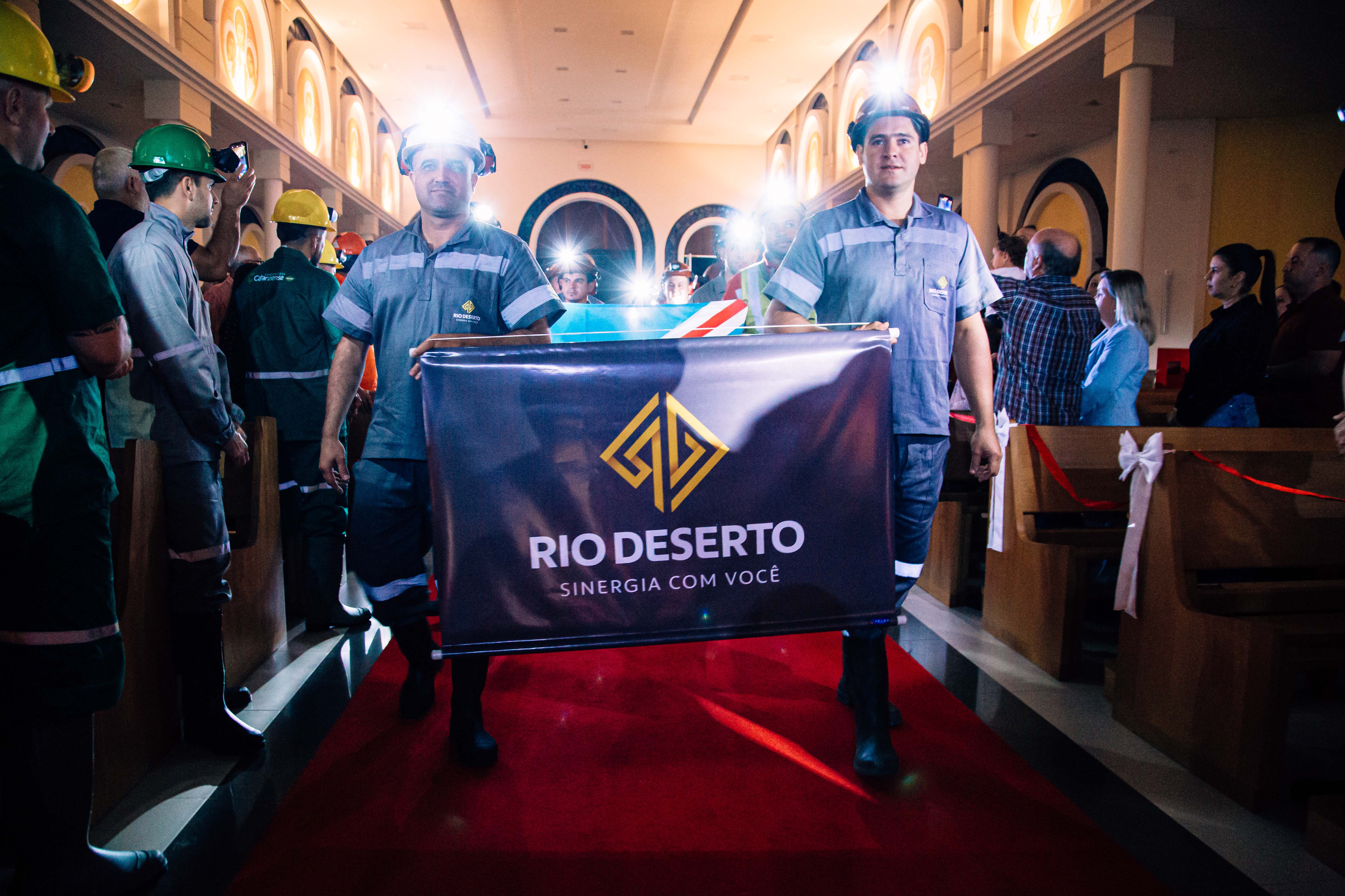 Os mineiros da Rio Deserto participaram da celebração levando a bandeira do município de Içara, banner da empresa e ofertório. Um dos colaboradores também fez a leitura de uma prece. Entre os momentos de mais emoção, destaque para a Bênção dos Capacetes, ao final da celebração, que levou os mineiros de todas as carboníferas ao altar.