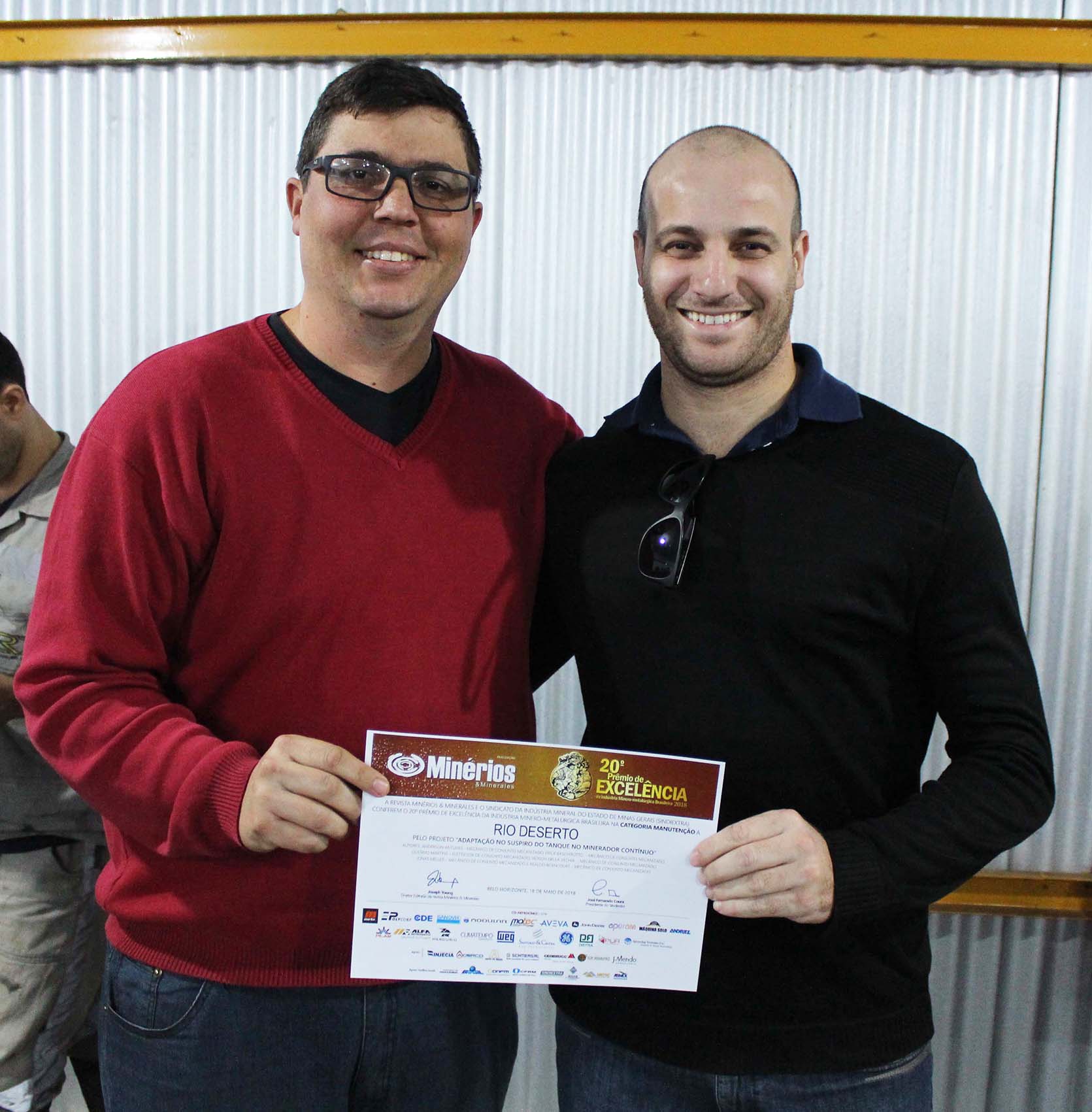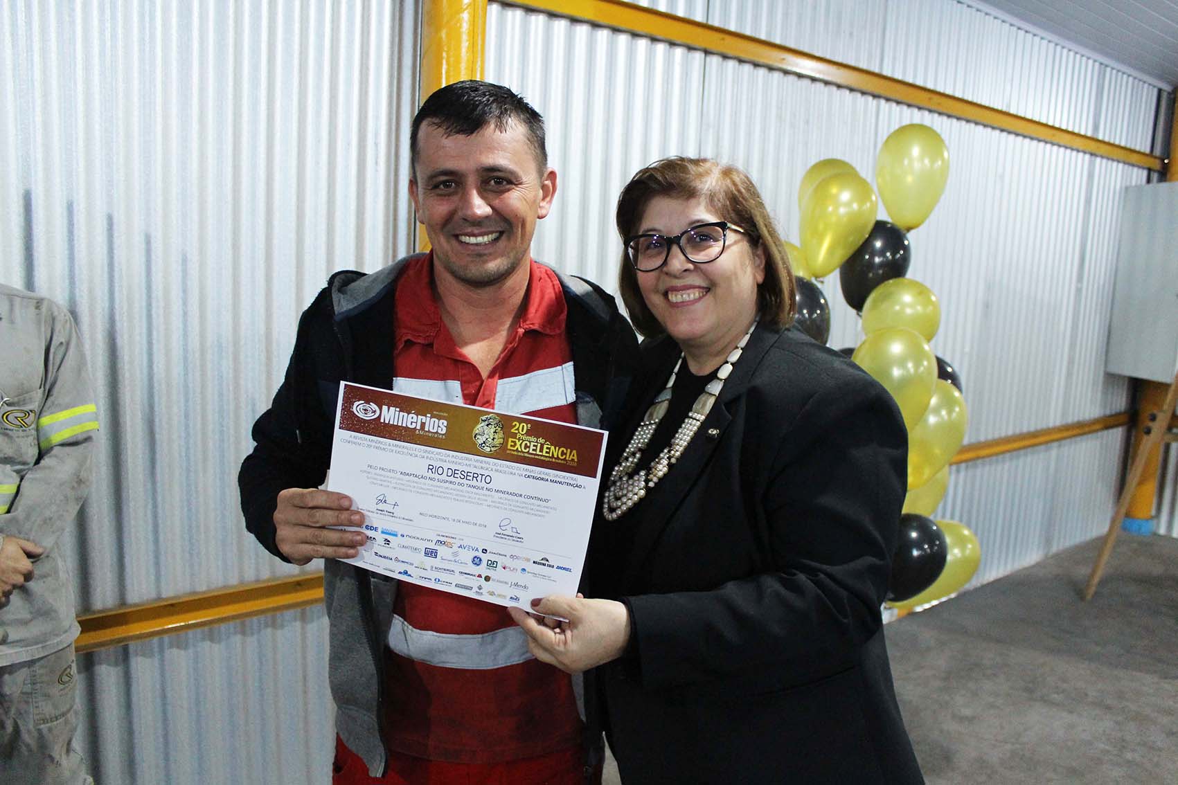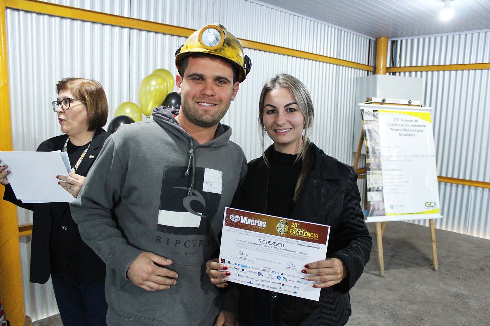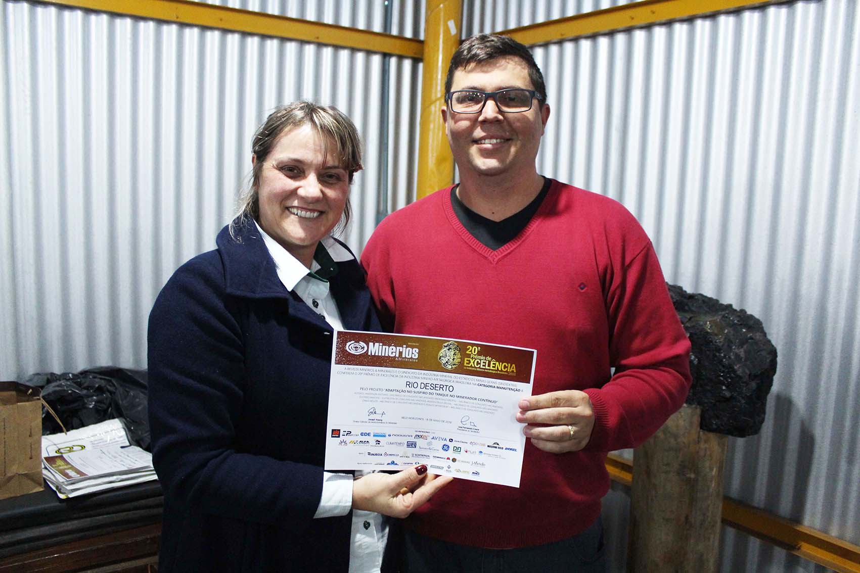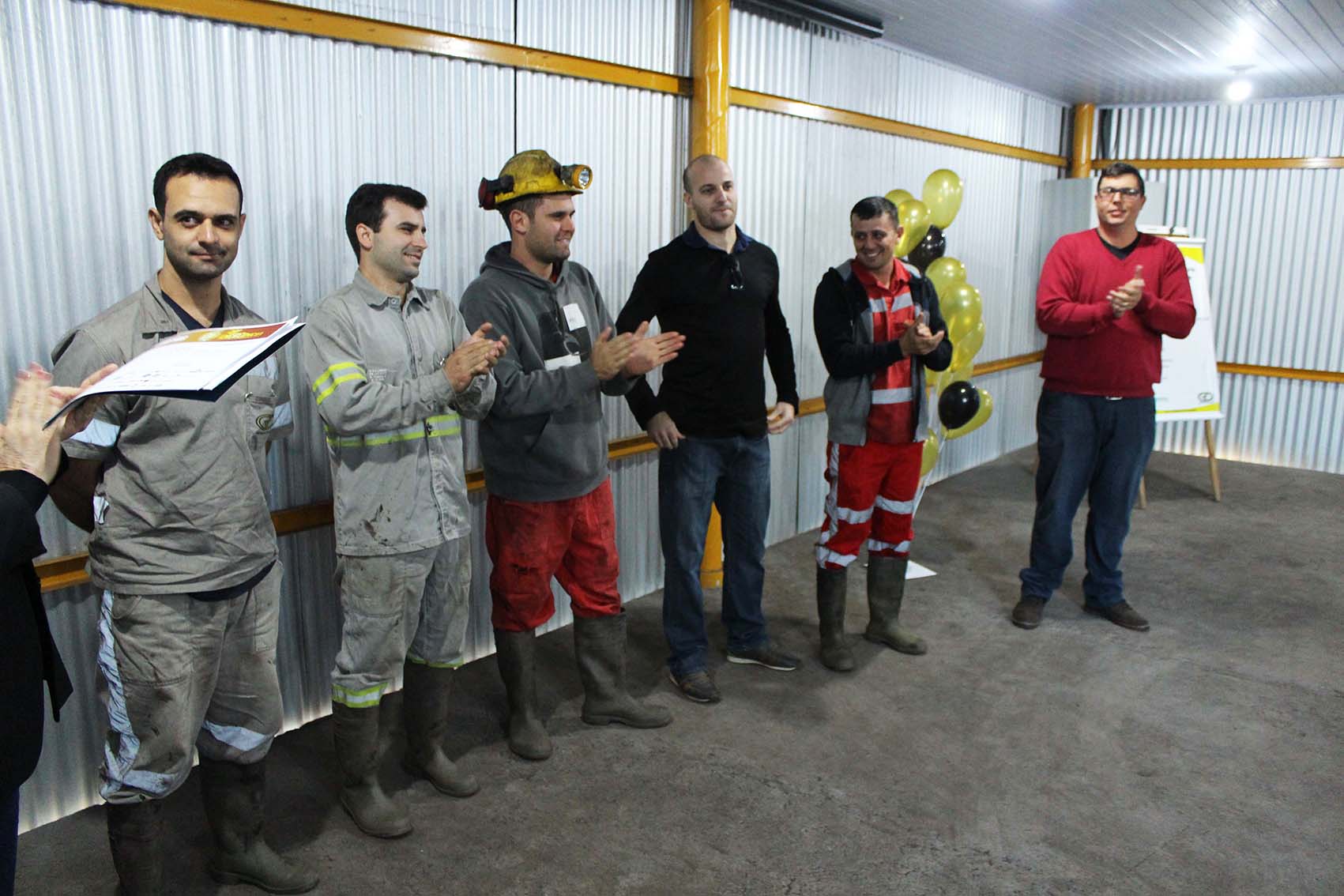O início do turno das 16 horas, na Unidade de Extração Mina 101, localizada em Içara (SC), das Empresas Rio Deserto, teve um momento especial na última terça-feira, dia 22. Na ocasião foram homenageados os colaboradores da equipe Fênix, do Programa de Inovação e Qualidade (PIQ), pela conquista de título no 20º Prêmio de Excelência da Indústria Minero-Metalúrgica Brasileira, com o projeto “Adaptação de Mangueiras no Suspiro do Tanque Minerador Contínuo”.  A premiação nacional foi entregue durante evento realizado em Belo Horizonte (MG), no último dia 15 de maio.