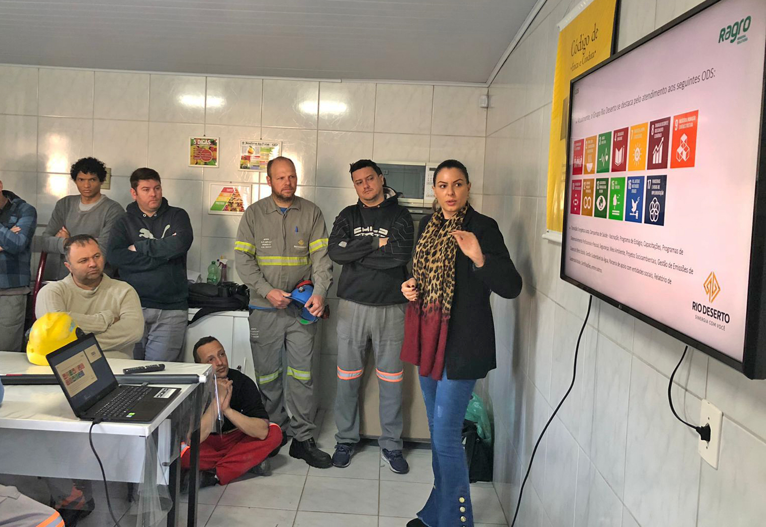 Com apresentação e dinâmica, os colaboradores da Ragro Mineral Solutions – unidade da Rio Deserto no segmento do agronegócio – passaram a conhecer um pouco mais sobre os ODS (Objetivos de Desenvolvimento Sustentável). A ação, realizada na manhã desta terça-feira, 27, foi promovida pela empresa em alusão à Semana ODS na Prática, realizada de 25 a 30 de setembro, em âmbito mundial, abrangendo cidades onde há comitês locais e/ou signatários.