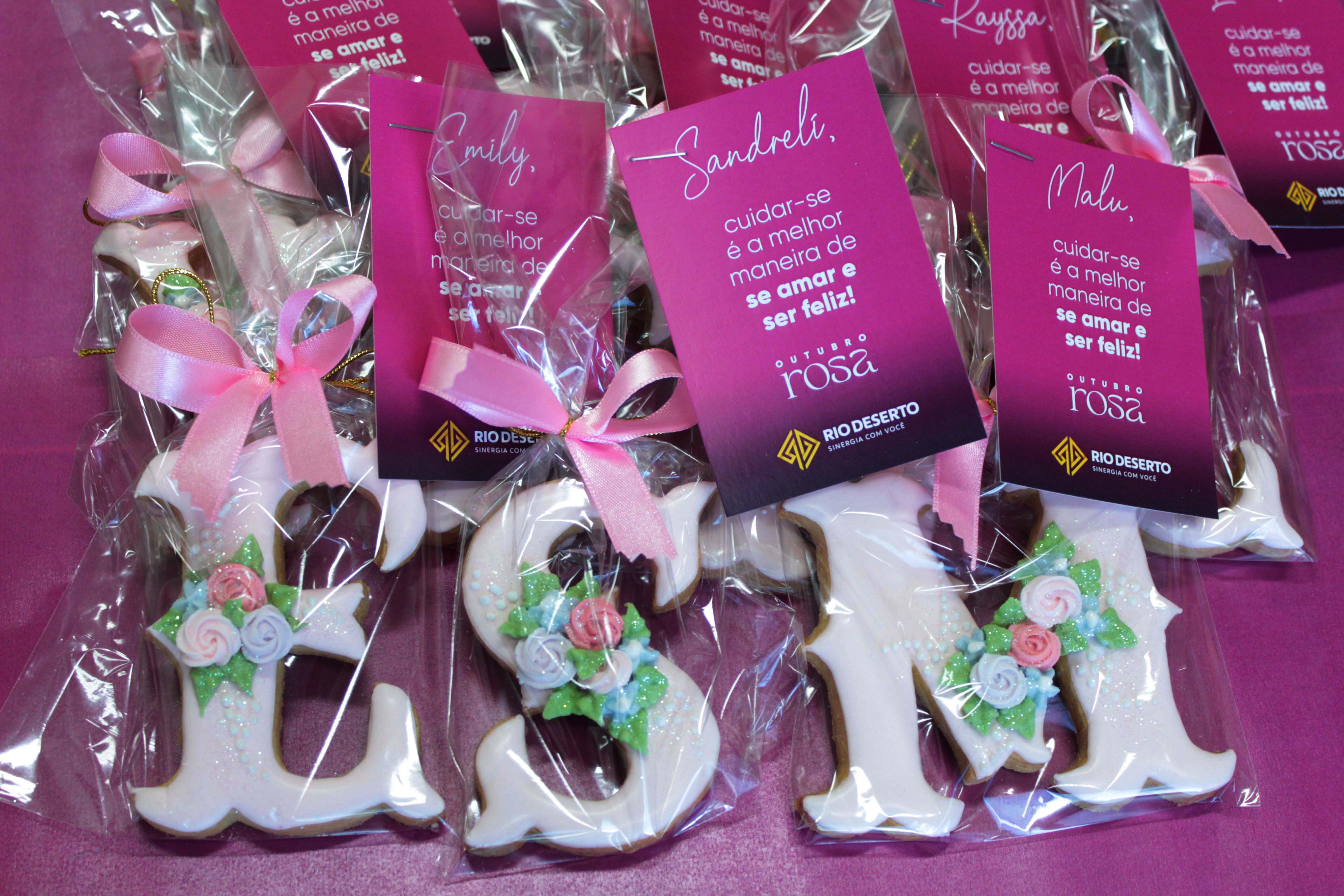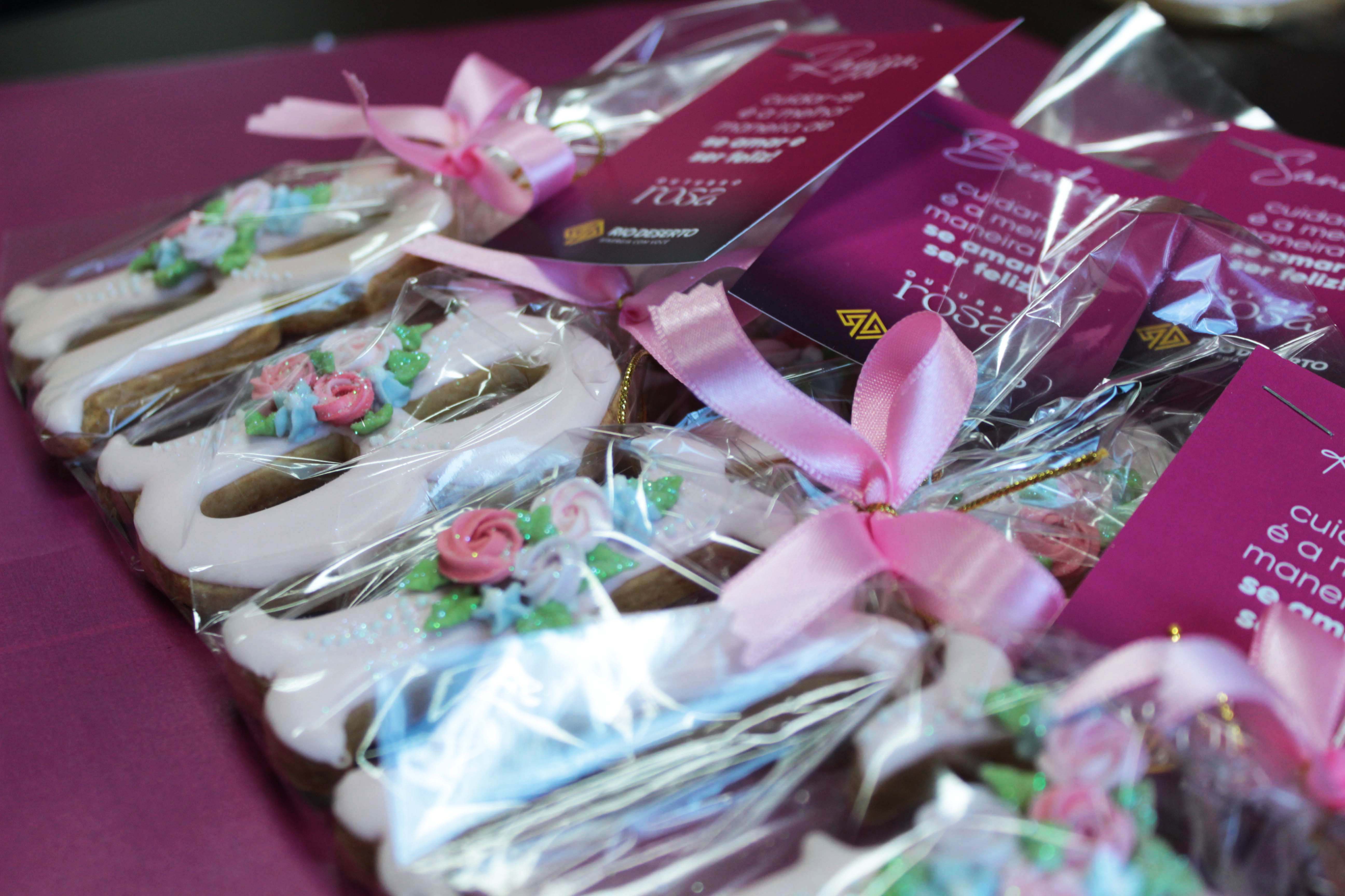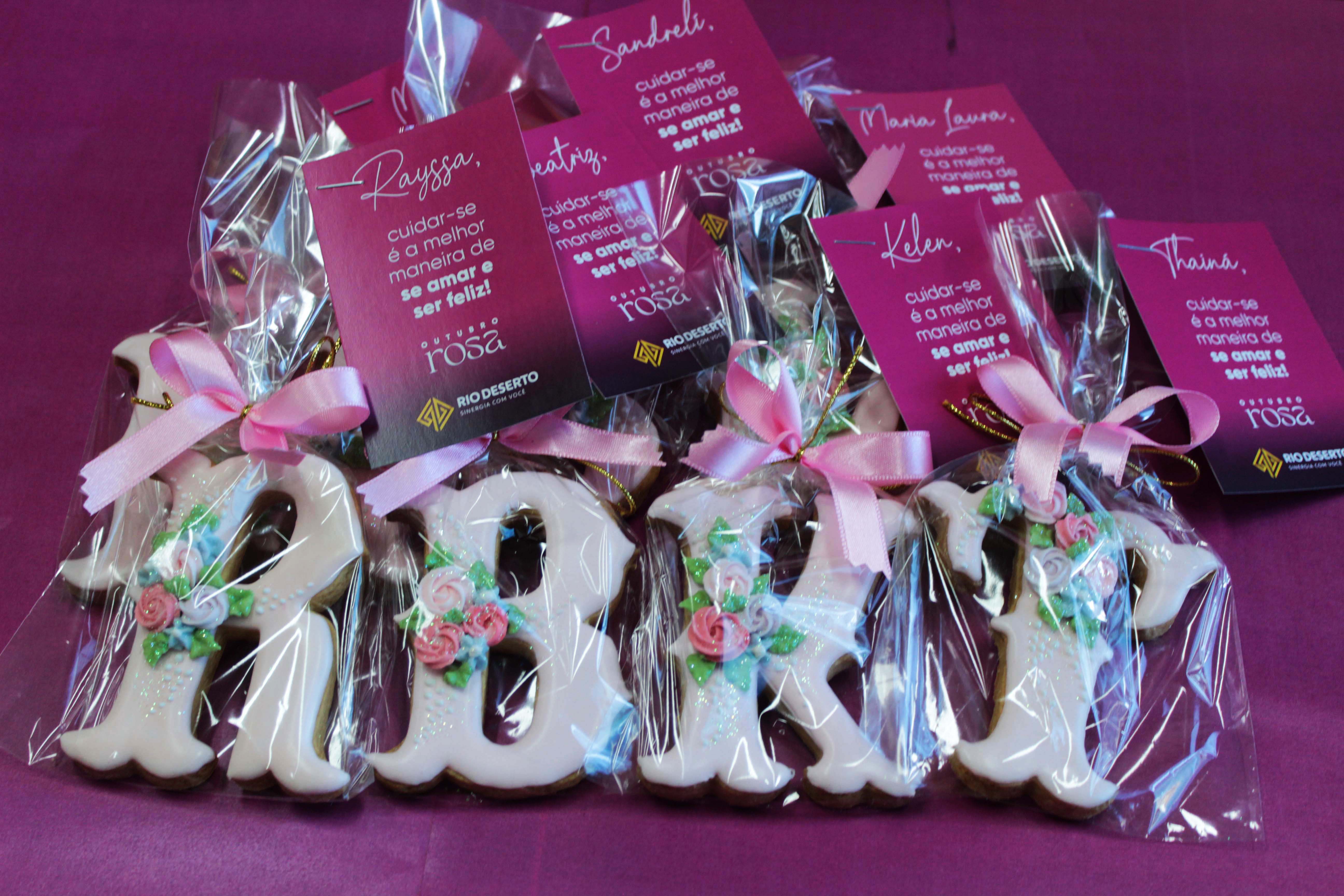 Neste ano, todas as colaboradoras da empresa receberam uma bolacha delicadamente personalizada com a letra inicial do próprio nome. Junto, havia um cartão com a identificação da colaboradora e a frase “Cuidar-se é a melhor maneira de se amar e ser feliz!”.