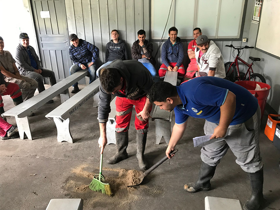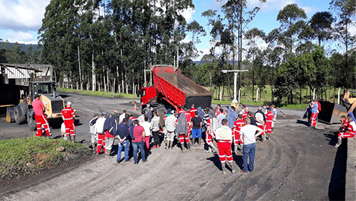 Mais de 60 colaboradores da Unidade de Extração Mina Cruz de Malta, da Rio Deserto, localizada em Treviso (SC), participaram, no dia 25 de maio, de treinamento teórico e prático de Planos de Emergência, que integra a formação/capacitação de brigadista. O treinamento contou com a presença dos membros da Defesa Civil de Santa Catarina, José Geraldo Conceição e Rosinei da Silveira (coordenador regional). A prática foi ministrada nas dependências da Unidade Mina Cruz de Malta e a teoria na Associação do Campo do Botafogo, localizada nas proximidades.