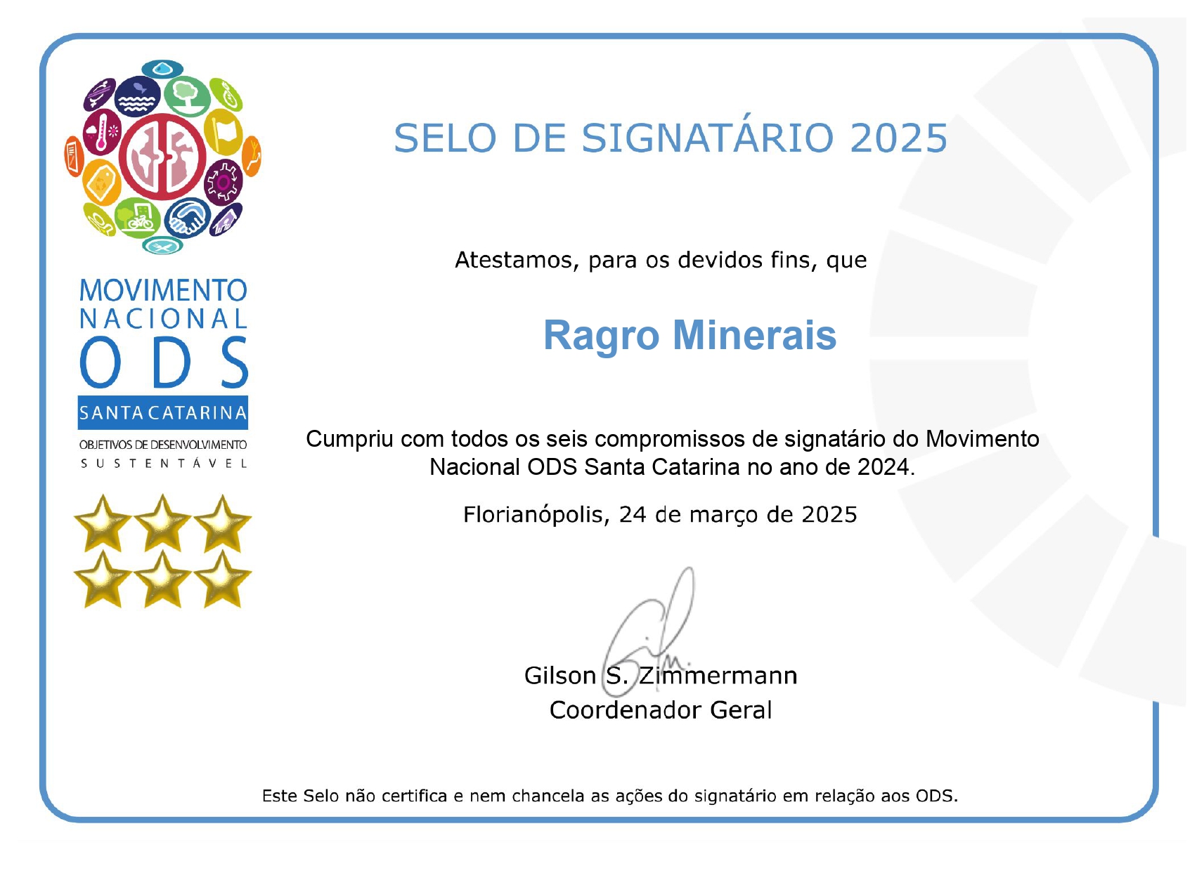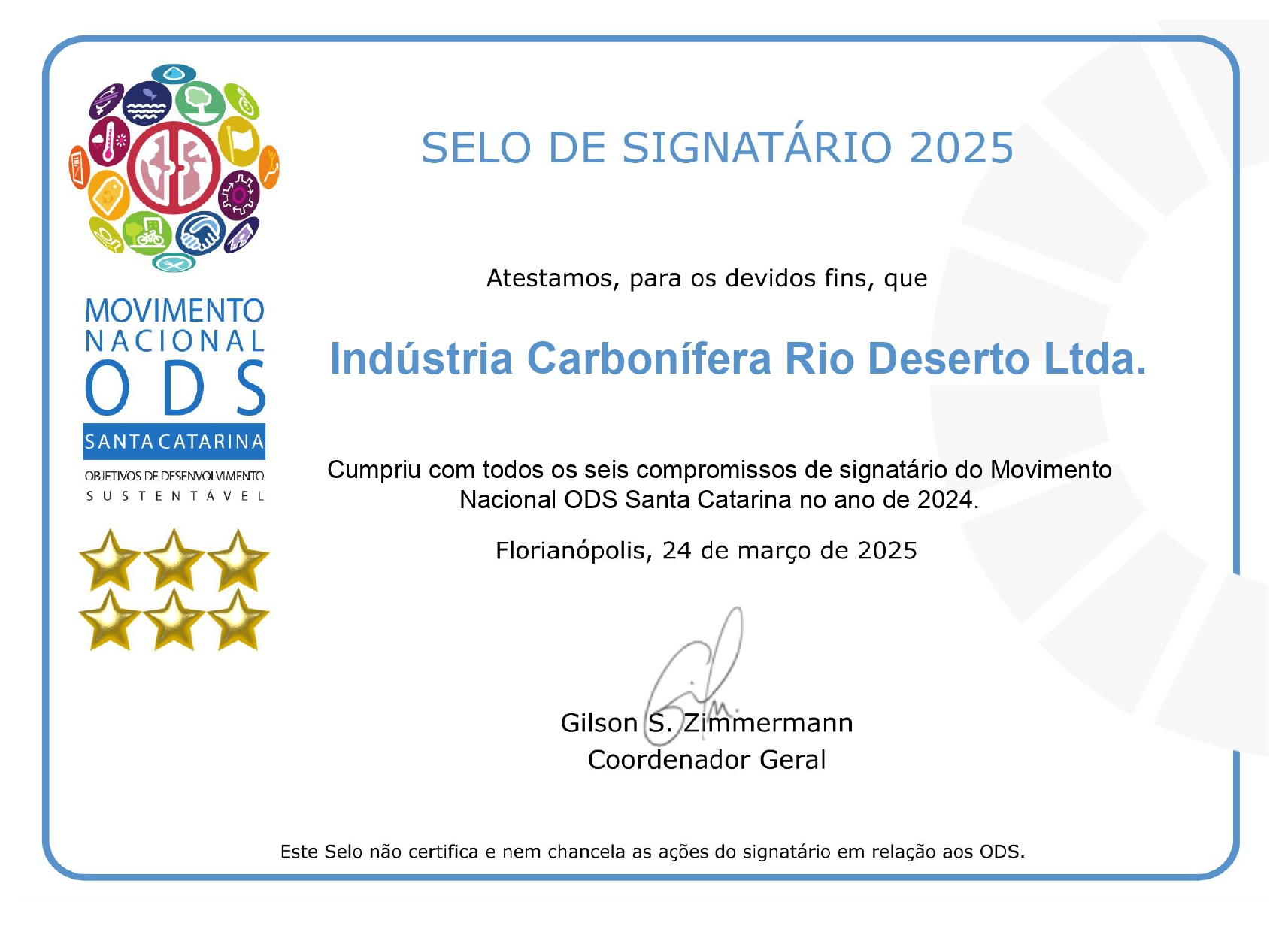 A Rio Deserto é empresa signatária desde 2020, sendo a primeira carbonífera do Sul de Santa Catarina a fazer parte do movimento. A Ragro Minerais aderiu no início de 2022. Ambas enviaram o Relatório de Compromissos referente ao ano de 2024 e receberam o Selo Signatário 2025, comprovando que estão em dia com as atribuições.