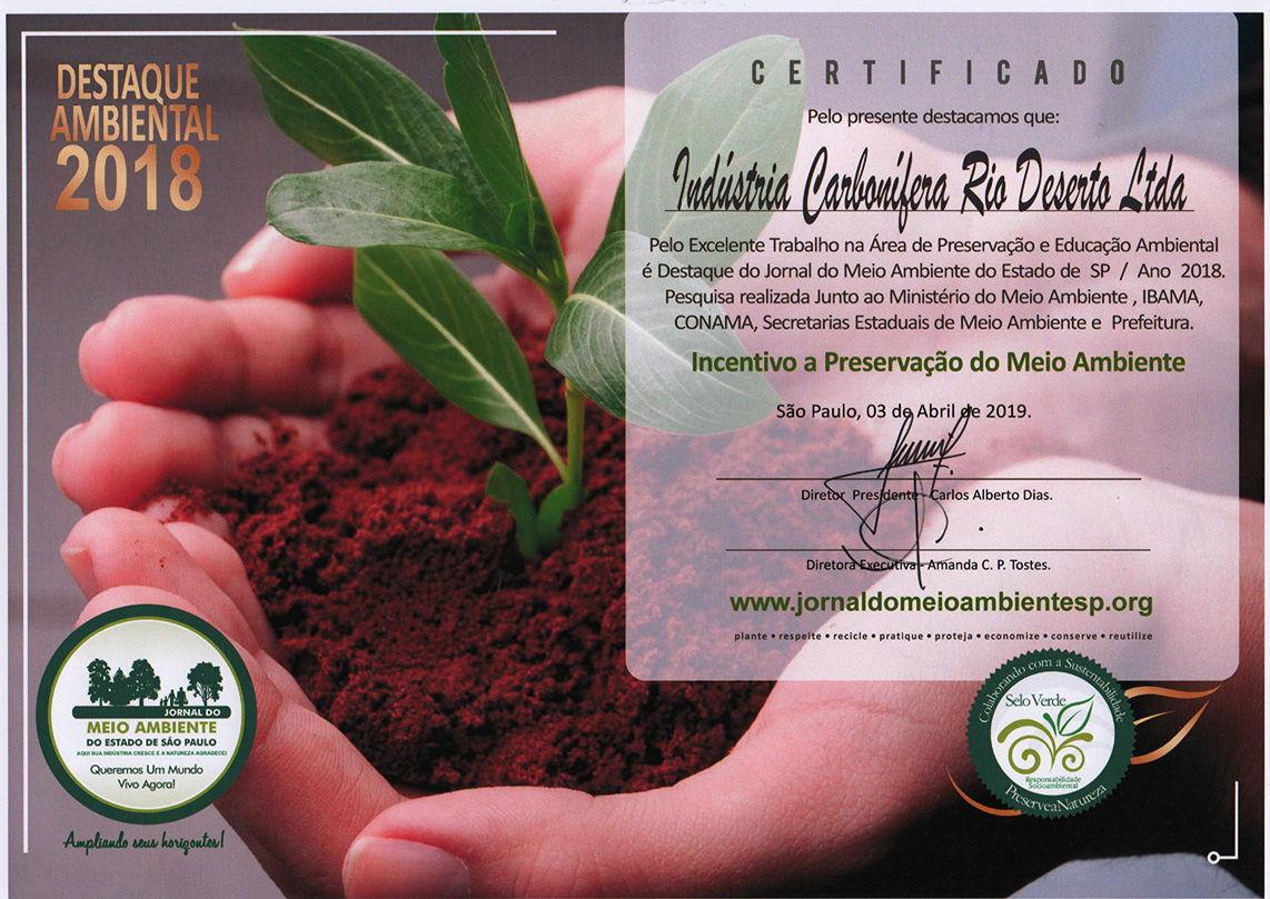 O Certificado de Destaque Ambiental – Selo Verde novamente foi entregue à Rio Deserto. O reconhecimento, emitido pelo Jornal do Meio Ambiente do Estado de São Paulo, leva em conta o trabalho na área de preservação e educação ambiental realizado no ano de 2018. A iniciativa busca reconhecer empresas públicas e privadas que conciliam práticas e desenvolvimento com a preservação de recursos naturais, respeito ao meio ambiente e prospecção social justa.
