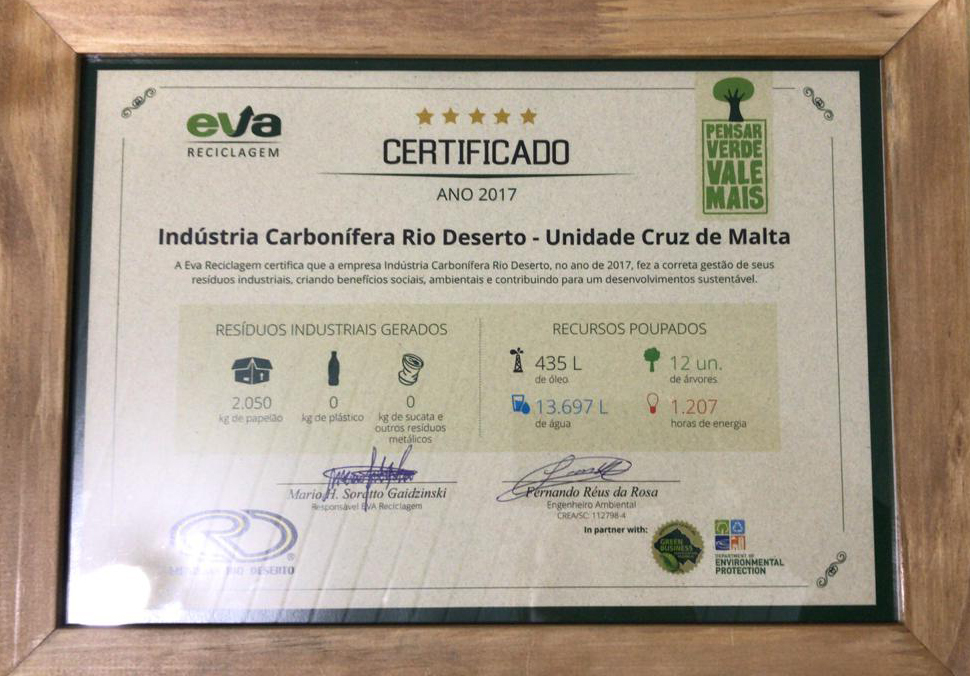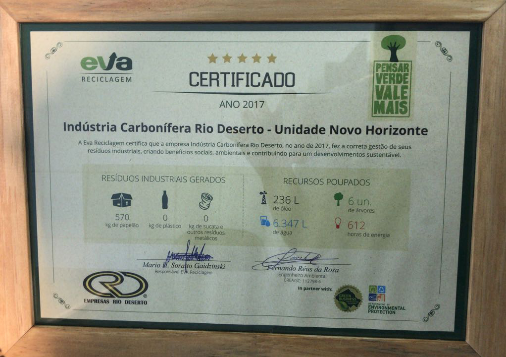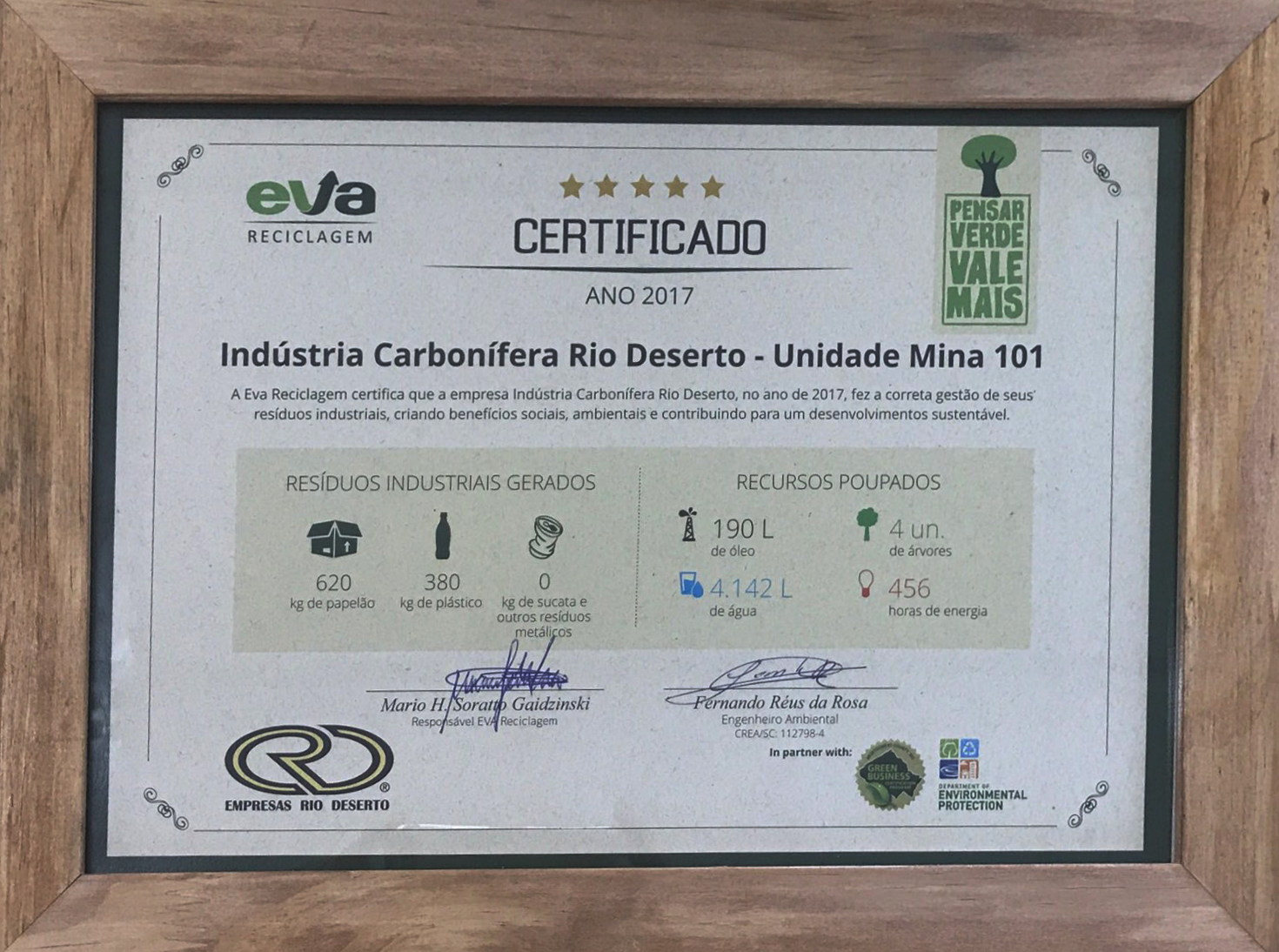 As Unidades de Extração das Empresas Rio Deserto – Mina 101, Mina Cruz de Malta e Mina Novo Horizonte – receberam o certificado por fazer a correta gestão dos resíduos industriais em 2017, criando benefícios sociais, ambientais e contribuindo para o desenvolvimento sustentável. O reconhecimento foi entregue pela empresa EVA Reciclagem neste mês de julho.